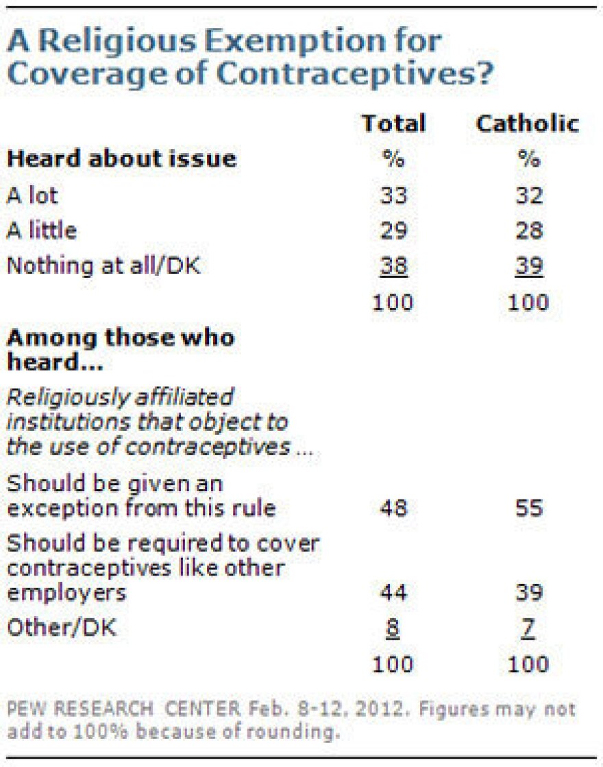 Independent voters surveyed were the most evenly split, with 48 percent saying that religious institutions should be required to provide contraception coverage, and 46 percent saying they should be "given an exemption."
