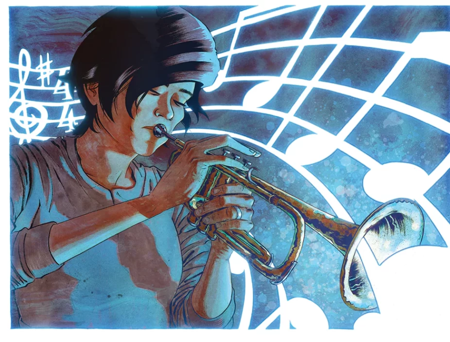 What is The Blue? A specific and highly mystical answer to that question can be found in Dave Chisholm’s graphic novel, produced by Z2 Comics in cooperation with Blue Note Records. With gorgeous and evocative illustrations, Enter the Blue tells the story of a frustrated musician, trumpeter Jessie Choi, and her journey into an alternate dimension — a plane where elite improvisers like Clifford Brown find a magic flow state. Along the way, Chisholm shrewdly riffs on jazz history and Blue Note iconography, while adhering to a touching human tale.
